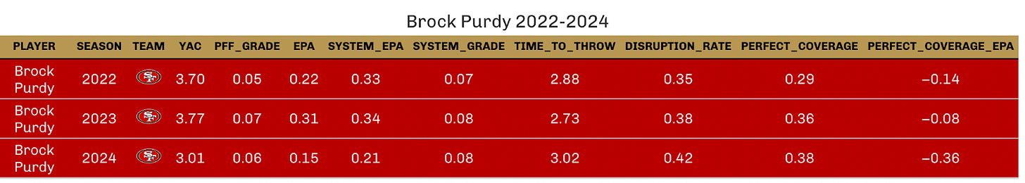 In areas where we can quantify the influence of the scheme, the numbers reveal some erosion. The rate of perfect coverage faced by the 49ers declined for a third straight year — still among the best in the NFL, but trending in the wrong direction — and Purdy faced more disrupting events than in seasons past. More troubling, he was significantly less effective against perfect coverage than in previous years.