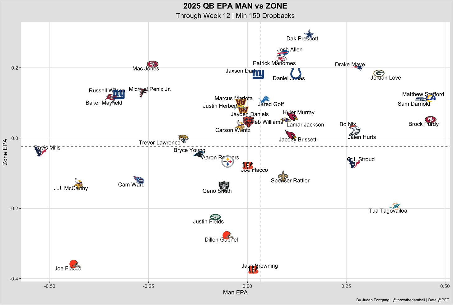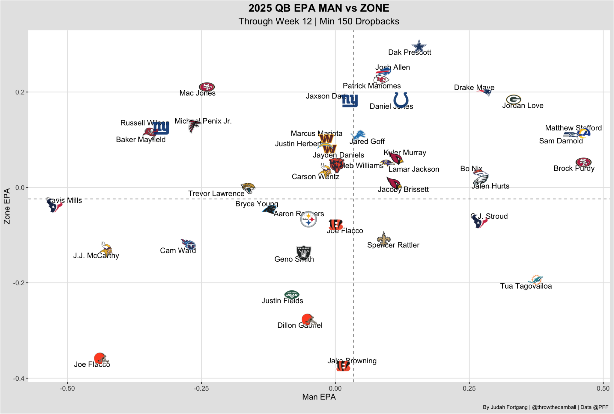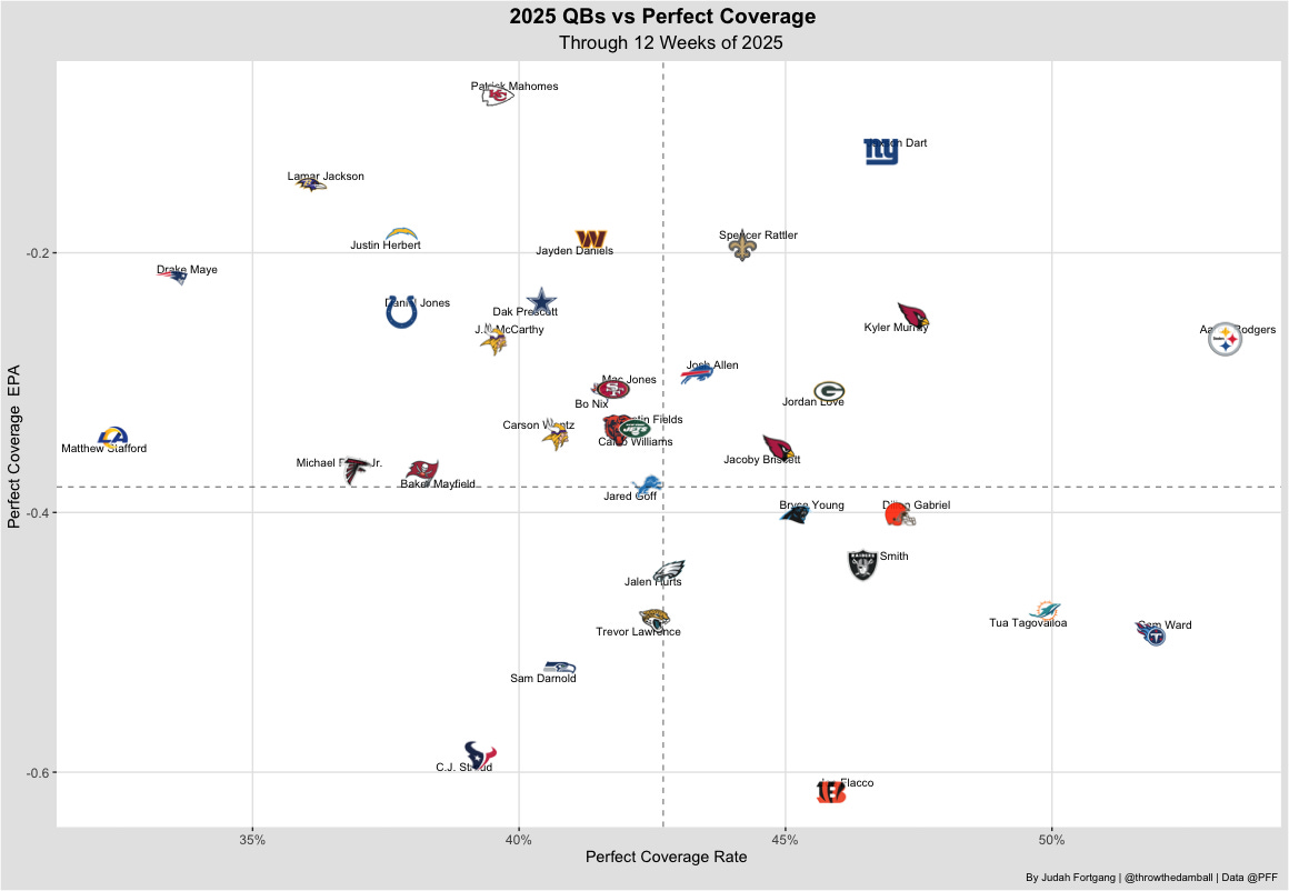Goff this year has been better against these zones than he has been in man, but has struggled to defeat perfect coverage which the Packers have generated at the highest rate in the NFL over the last 6 weeks.