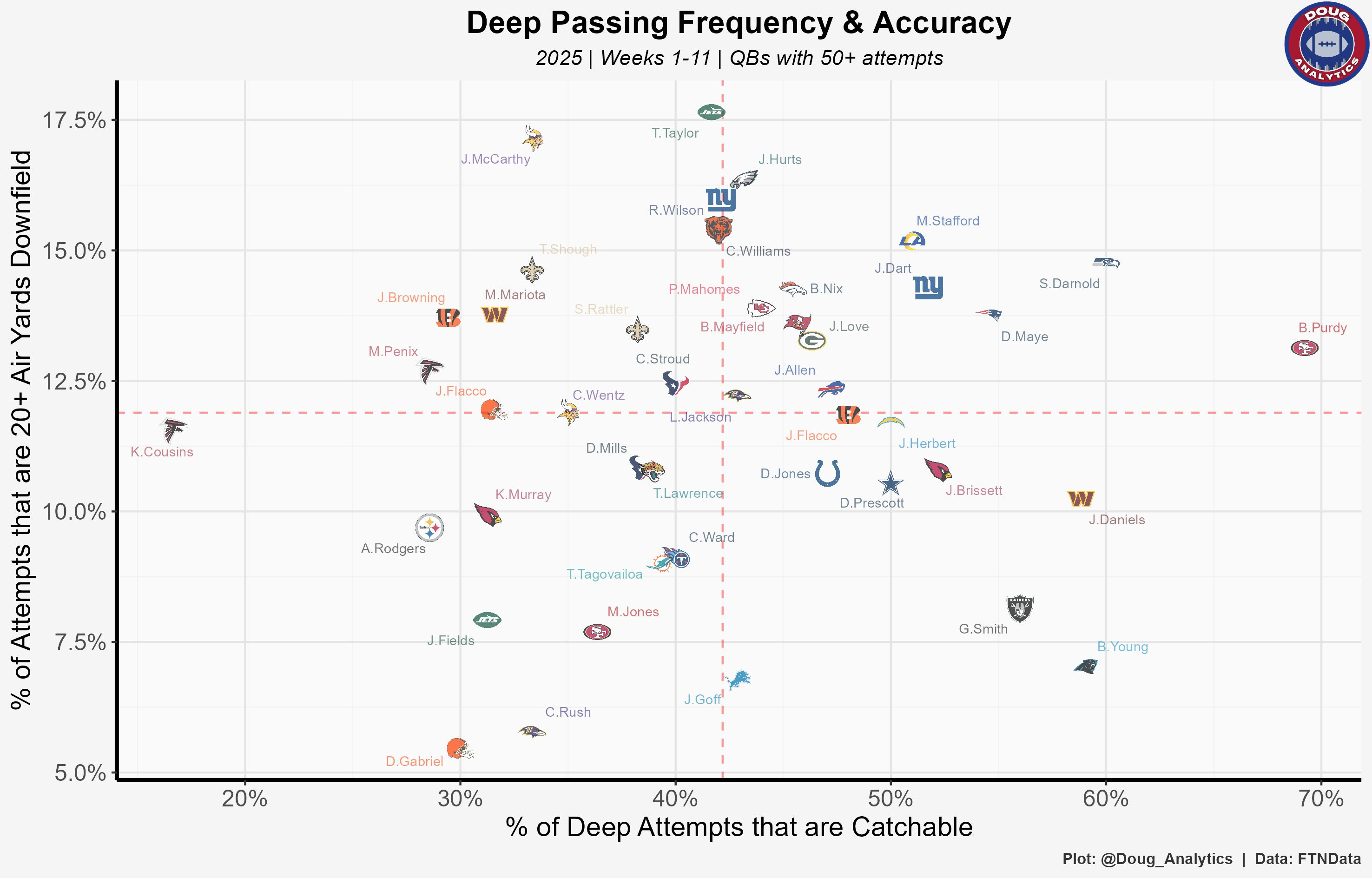 Different QB but this is still a spot where I’m seeing some value on the tails. Baltimore has been one of the highest single coverage defenses in the NFL where the Jets very sneakily have 3 85th percentile or better separators in John Metchie, AD Mitchell, and Isaiah WIlliams.