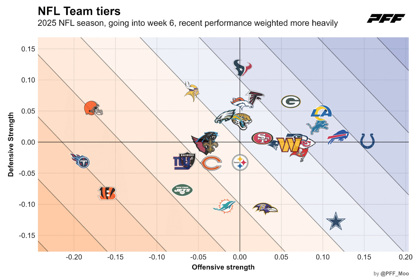 Here we have a chart courtesy of PFF’s Timo Riske outlining team strengths where the Bucs have the slight overall edge from a fundamentals point of view on the backs of a better offense but where the teams are roughly even. EPA, EDP other metrics will reveal a similar story. And with Purdy certainly an upgrade over Jones, with some injury uncertainty as well and we can see how the market has arrived at the pricing for this game.